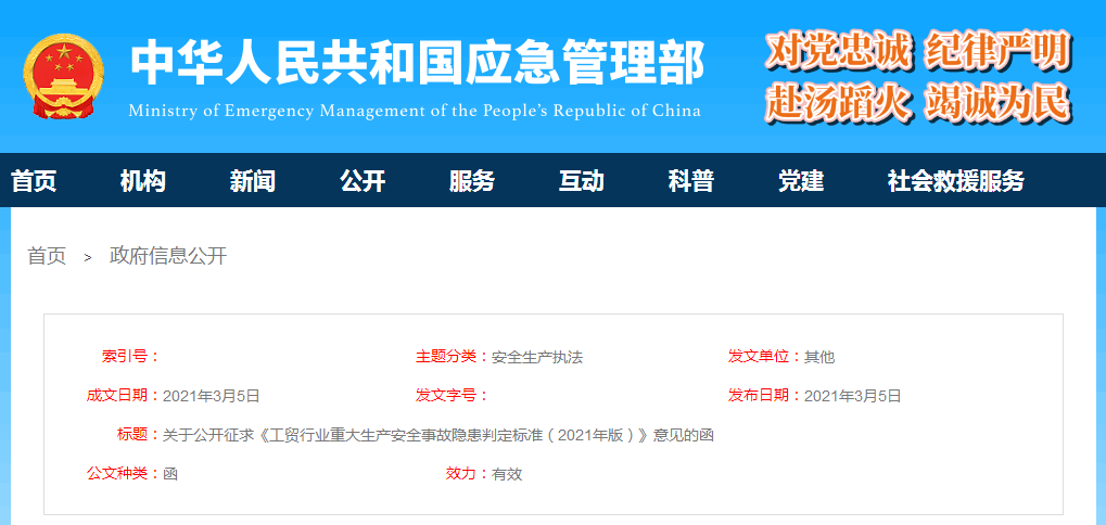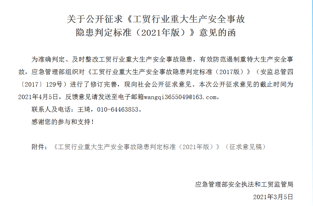 为准确判定、及时整改工贸行业重大生产安全事故隐患,有效防范遏制重特大生产安全事故,应急管理部组织对《工贸行业重大生产安全事故隐患判定标准(2017版)》(安监总管四〔2017〕129号)进行了修订完善,现向社会公开征求意见。本次公开征求意见的截止时间为2021年4月5日,反馈意见请发送至电子邮箱wangqi3655049@163.com。